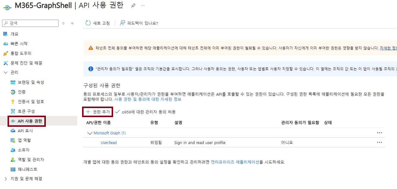 해당 Graph Shell을 Azure AD의 앱을 통해 필요한 API (Graph Shell)에 대하여 권한을 할당해준 뒤