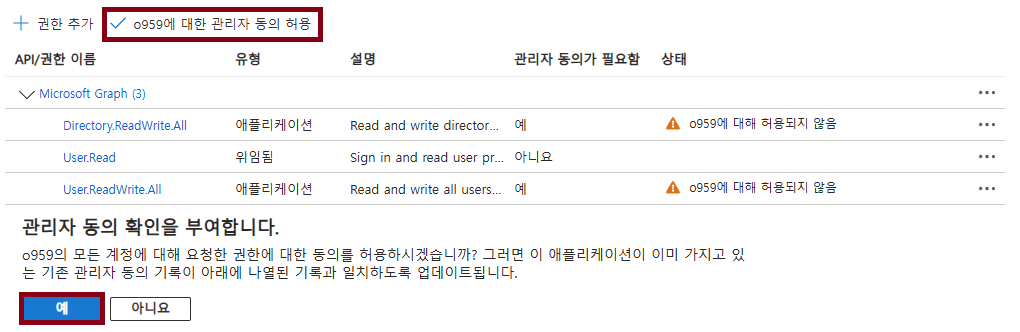 [관리자 동의 허용 클릭] 후 허용됨 으로 변경이 되었는지 확인해주세요