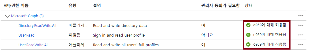 [관리자 동의 허용 클릭] 후 허용됨 으로 변경이 되었는지 확인해주세요