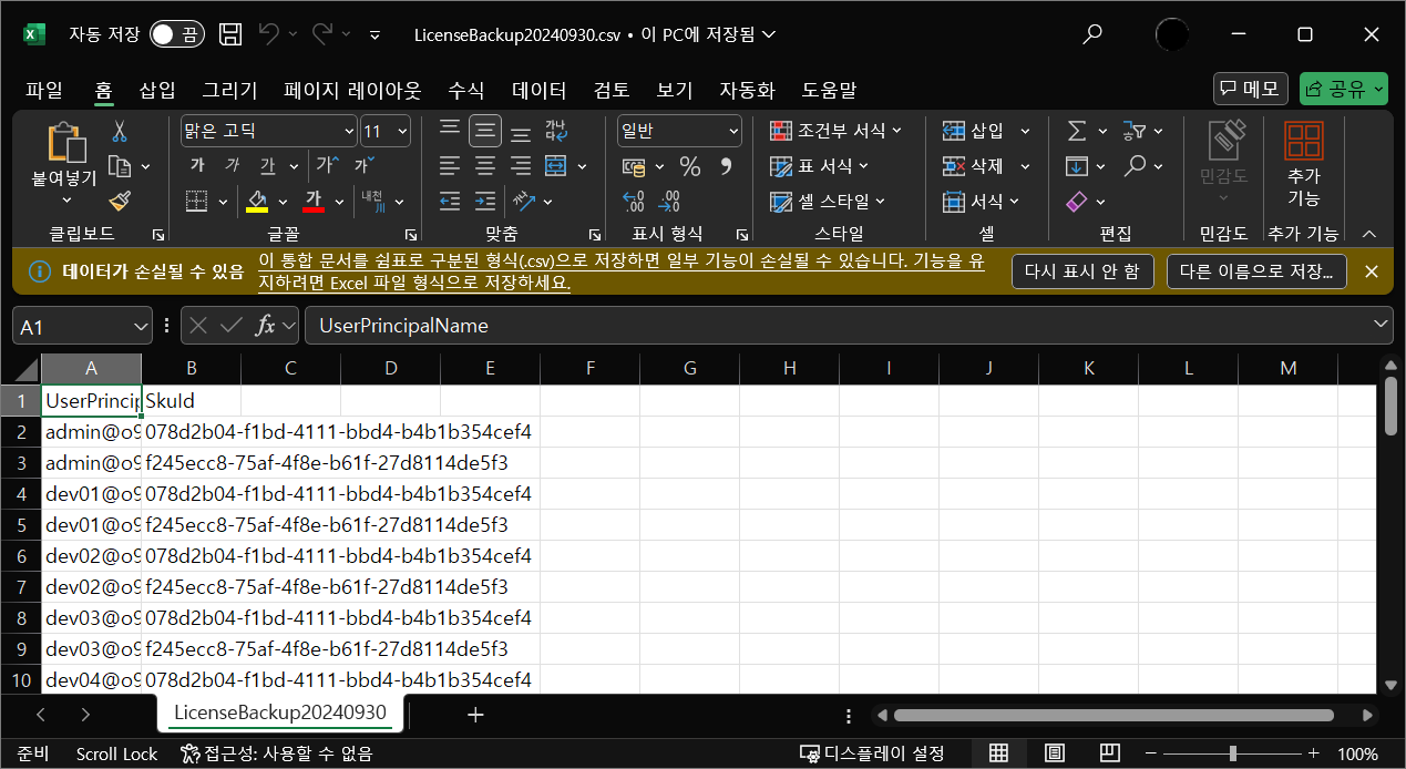 아래 스크립트를 통해 테넌트의 모든 사용자의 라이선스를 Export 할꺼에요