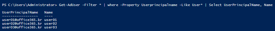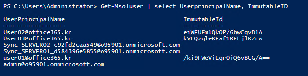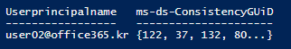 Get-Msoluser -UserPrincipalName user02@office365.kr | Select DisplayName, UserPrincipalName, ImmutableId, `