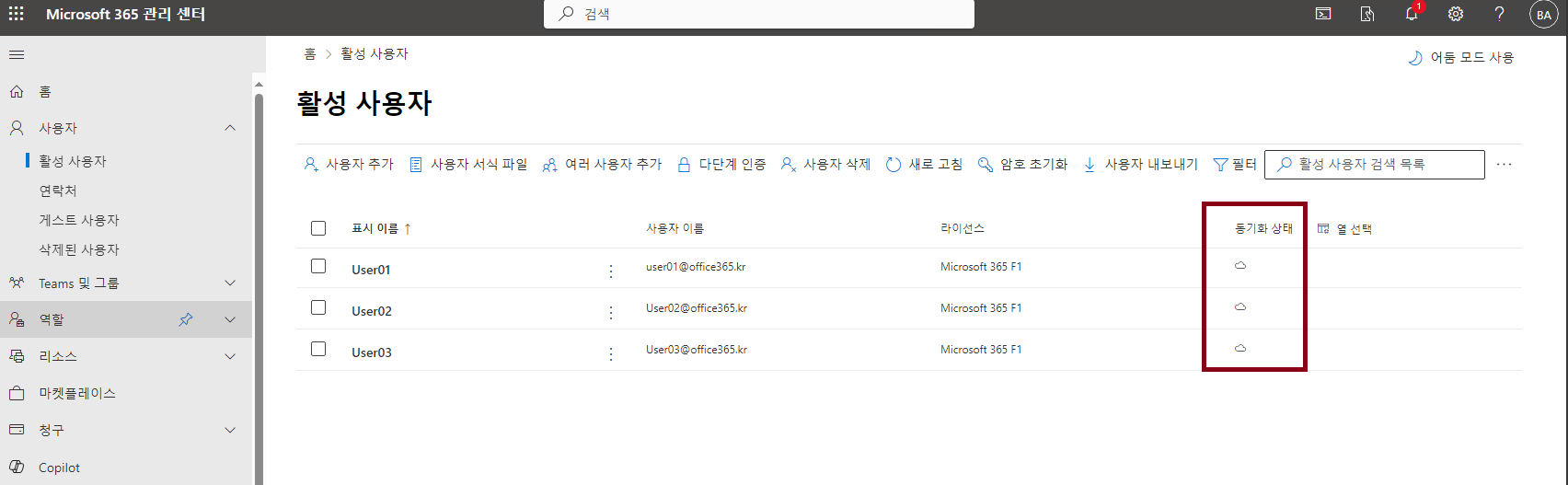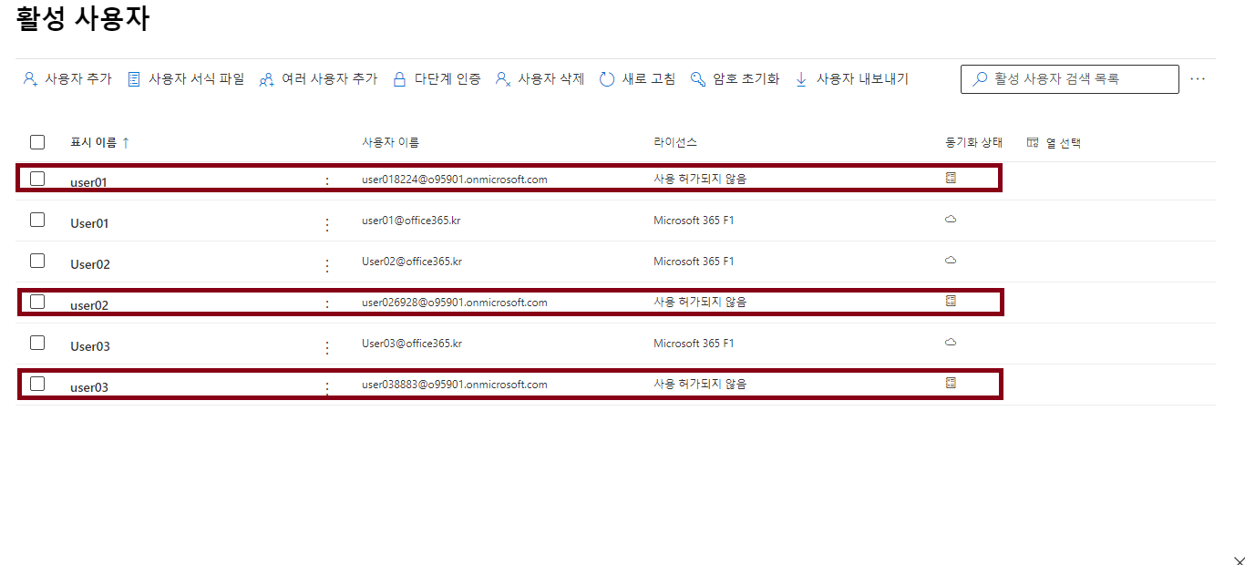우선 잘못생성된 계정들을 삭제해야하니, AD에 User01~03 계정을 삭제하고 동기화해주세요