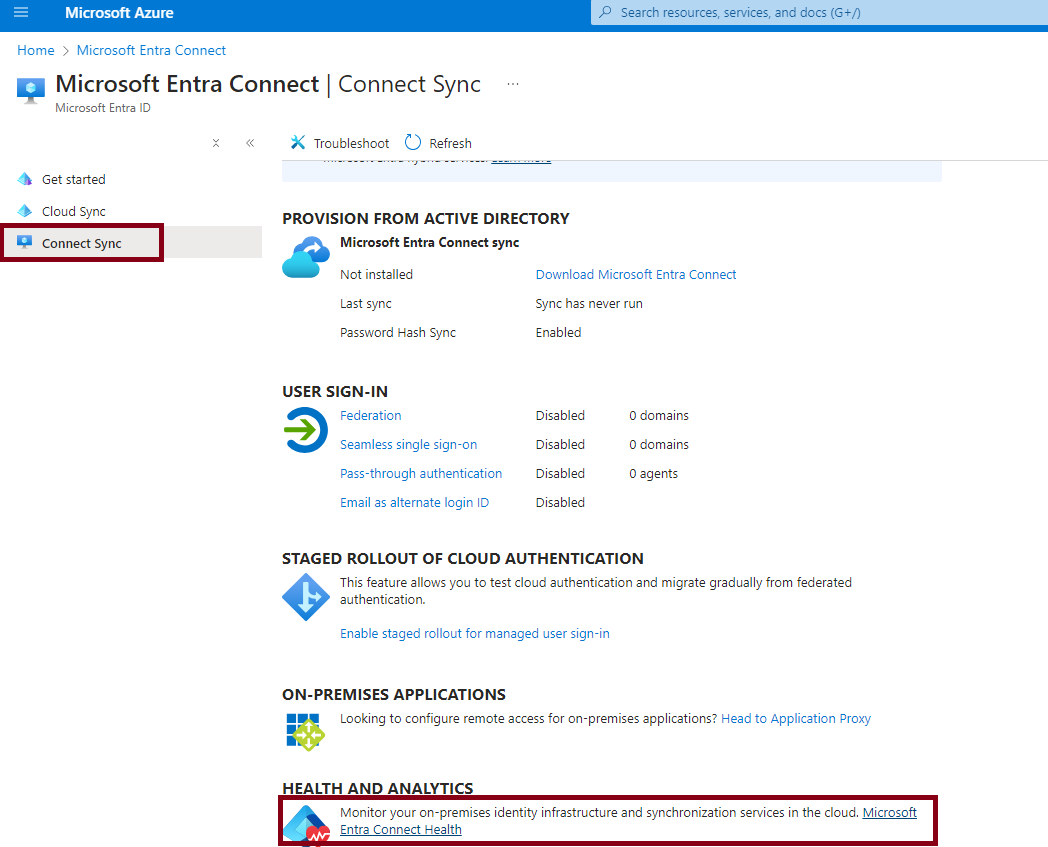 그리고 "Connect Sync" 메뉴 접속 그리고 하단의 "Microsoft Entra Connect health"를 클릭해주세요