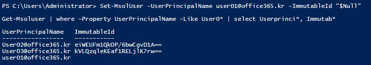 Set-MsolUser -UserPrincipalName user01@office365.kr -ImmutableId "$Null"