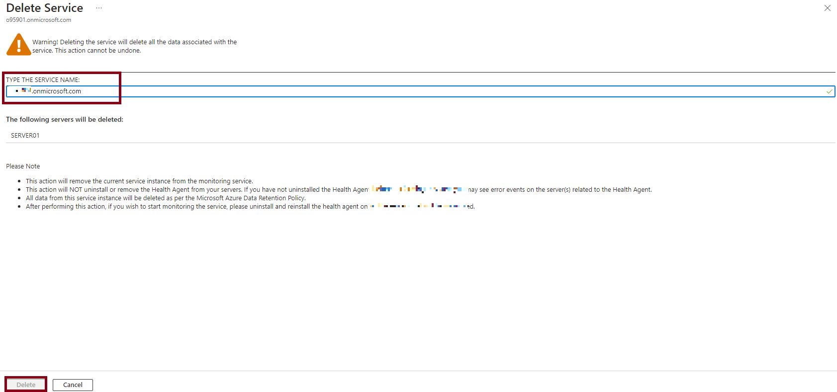 서비스 이름을 입력한 뒤 "Delete"를 클릭해서 삭제를 완료해주세요