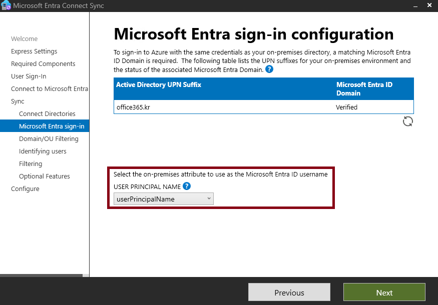 이번엔 CUserPrincipalName을 사용할 값을 UserPrincipalName값으로 동기화 될 수 있도록 설치를 진행했어요