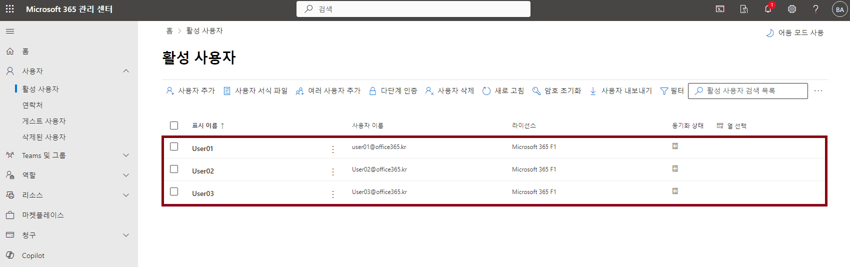 우선 잘못생성된 계정들을 삭제해야하니, AD에 User01~03 계정을 삭제하고 동기화해주세요