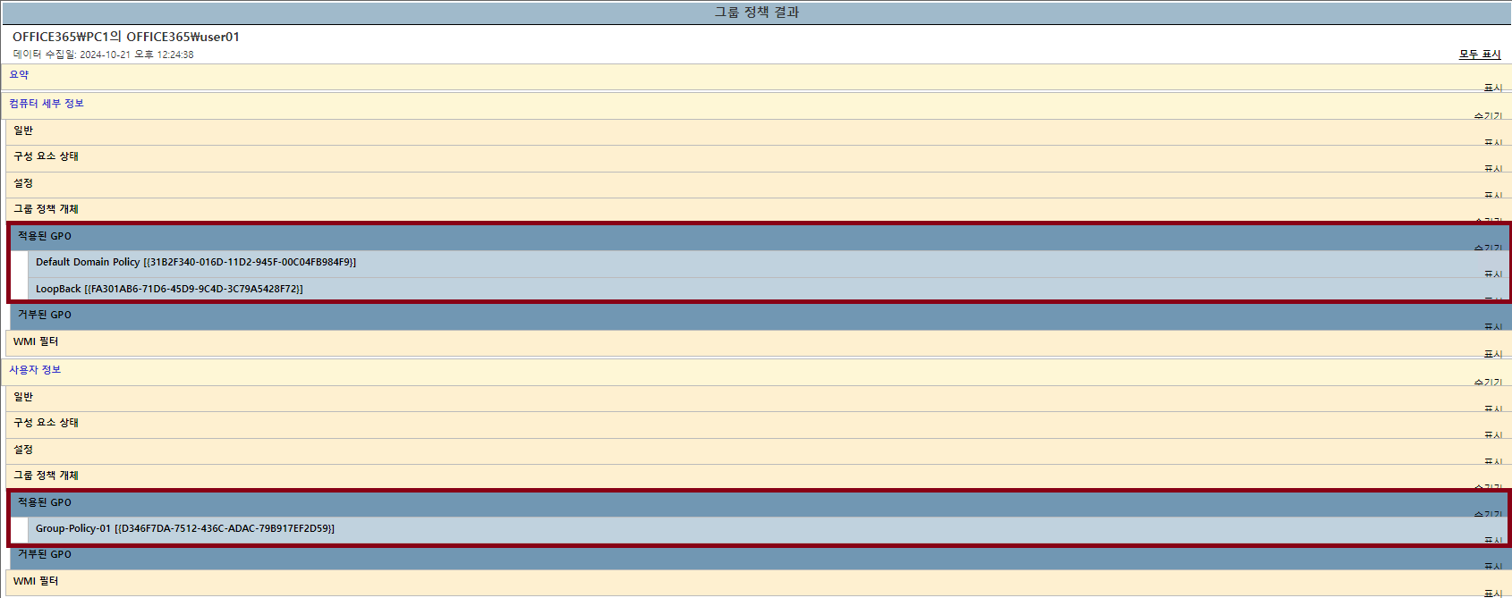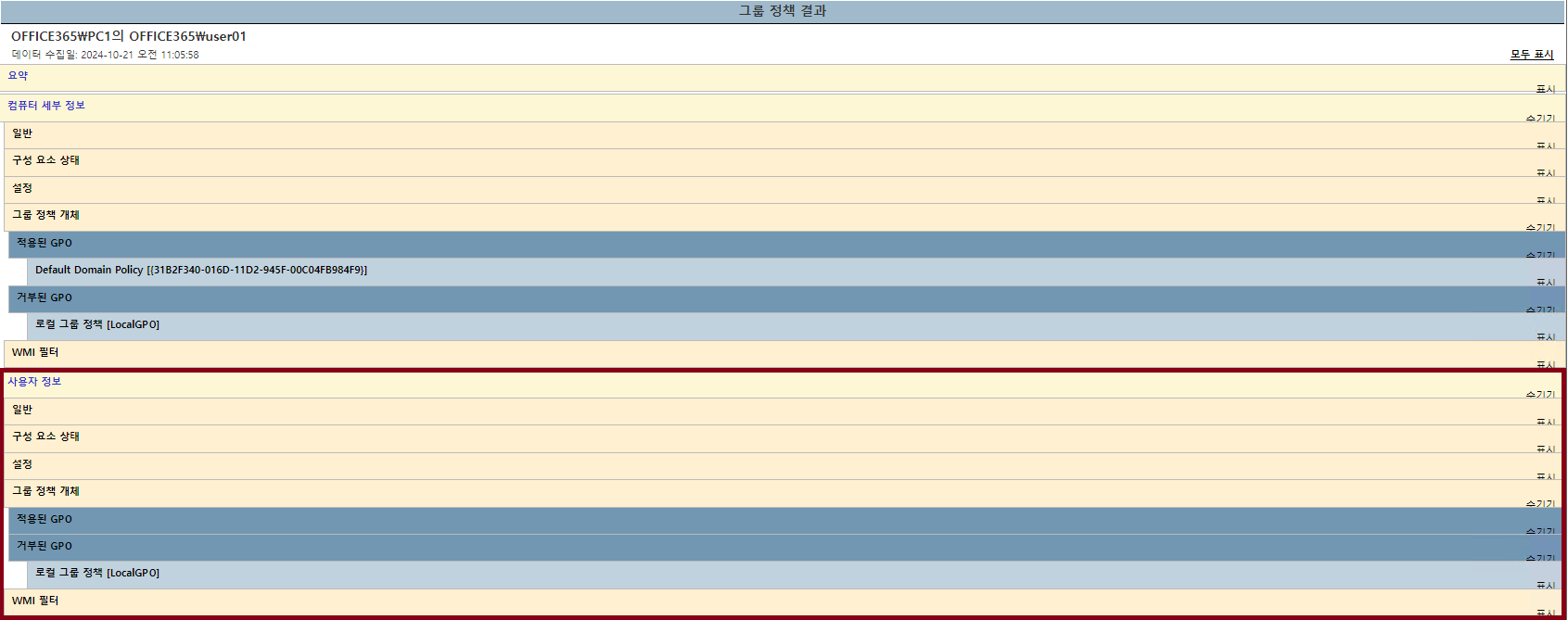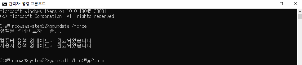 그룹정책을 받아오도록 한 뒤, 그룹 정책 결과를 확인했어요