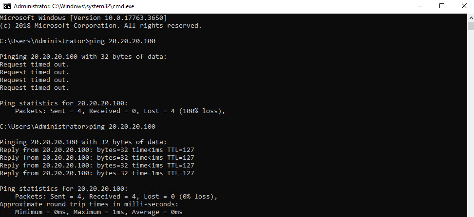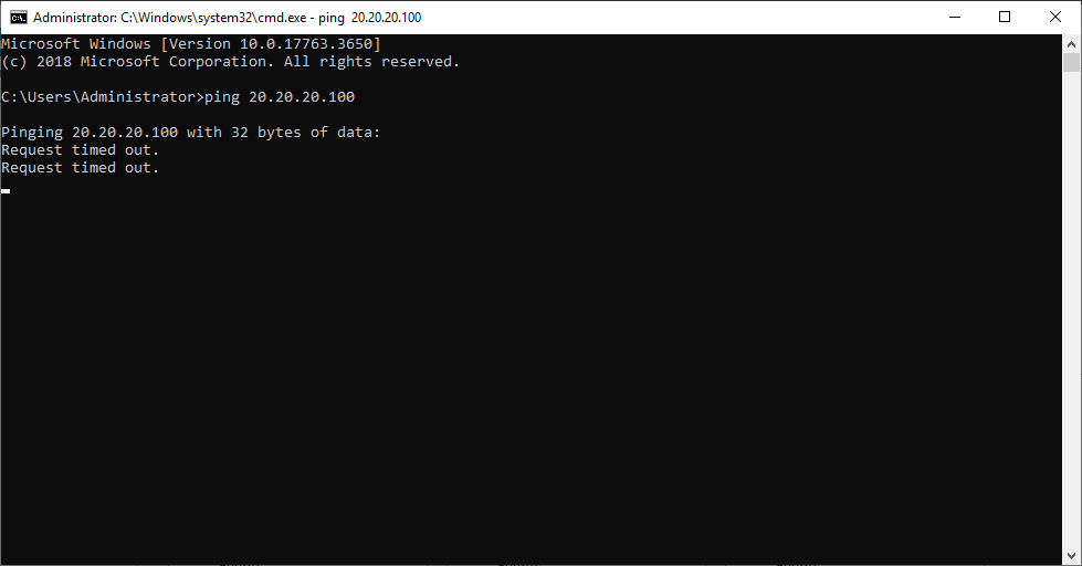10.10.10.100 서버에서 20.20.20.100 서버로 Ping 테스트를 해보니 통신이 되지 않는게 확인 되네요