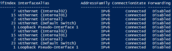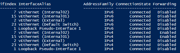 Get-NetIPInterface | Ft Ifindex, InterfaceAlias, AddressFamily, ConnectionState, Forwarding