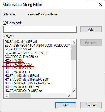 특성 편집기 - servicePrincipalName 속성 내 값 중에 AD03 이라는 변경 전 값들을 전부 삭제해주세요
