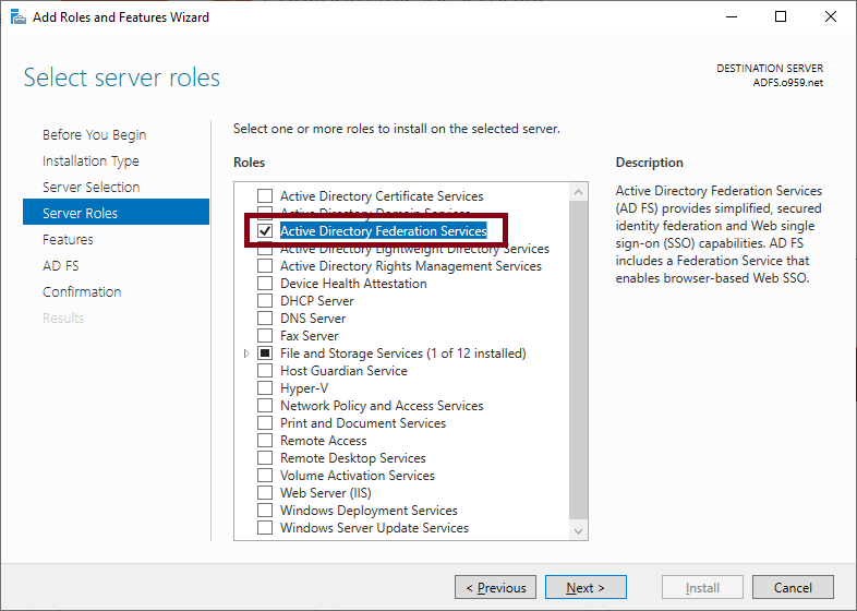 서버 관리자에서 - ADFS 기능을 선택하고 설치 해주세요