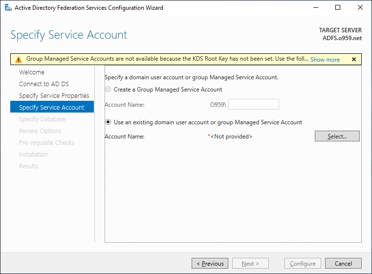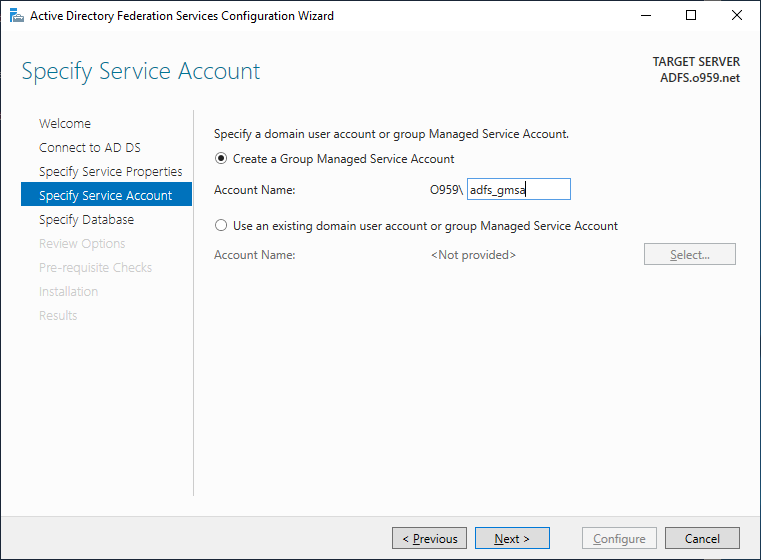 이후 Previous 후 Next로 다시 페이지에 넘어온다면 gMSA가 활성화 되며 계정 이름을 지정하여