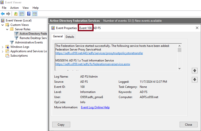 이벤트뷰어 - 관리이벤트 - ADFS EventID 100이 출력되어 있으면 서비스가 정상적으로 실행 됬다고