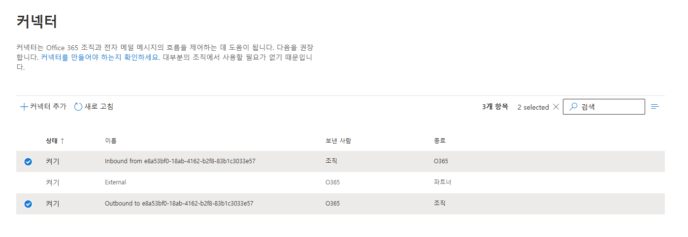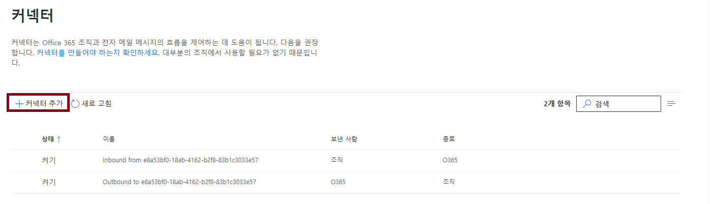 커넥터 추가를 클릭해서 Exchange Online에서 메일 외부로 송신하는 커넥터를 생성해주세요