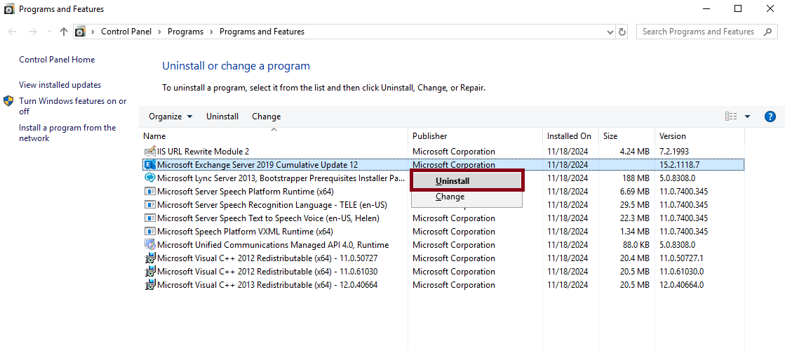 프로그램 추가/제거에서 Exchange Server를 Uninstall을 해주세요