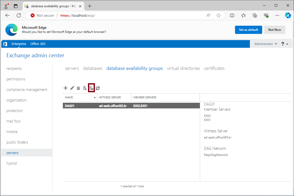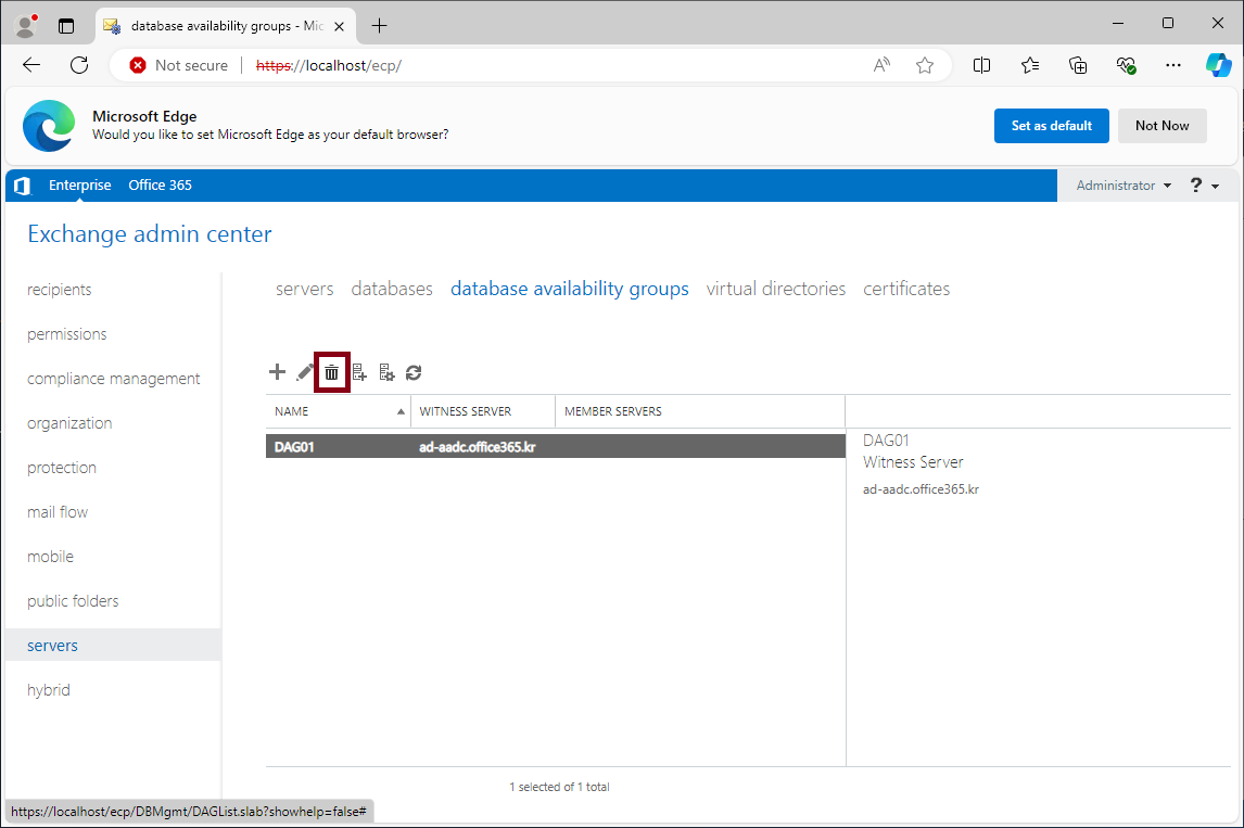 On-Premise Exchange 관리센터에 접속해서 DAG의 구성원 서버를 삭제해주세요