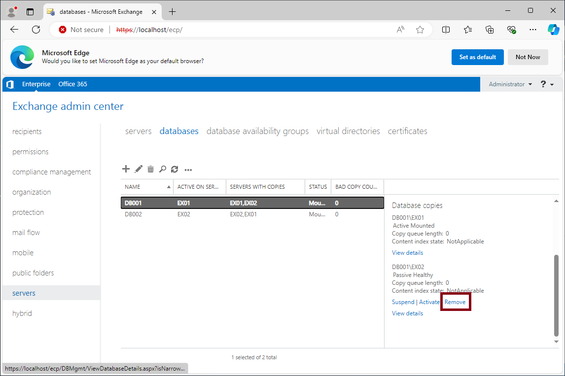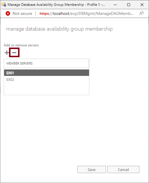 On-Premise Exchange 관리센터에 접속해서 DAG의 구성원 서버를 삭제해주세요