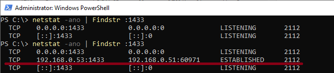 sqlservr.exe가 PID 2112를 갖고 1433 포트에 대해 Listening하고 있는 상태네요!