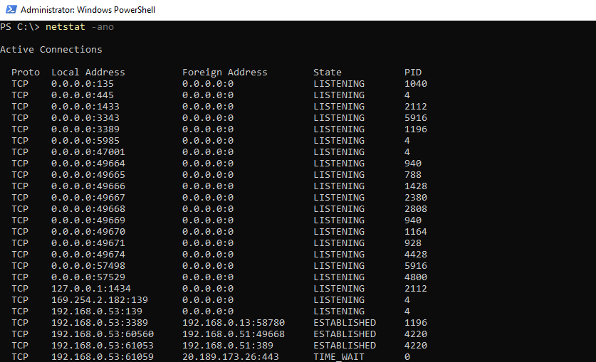 위 명령어를 사용하여 Windows Server에서 어떠한 프로세스들이 어떠한 포트를 이용하여
