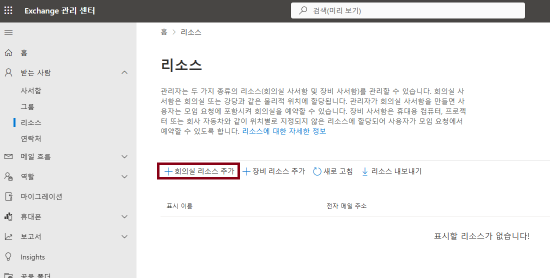 Exchange 관리센터 - [받는 사람] - [리소스] - 회의실 리소스 추가 클릭