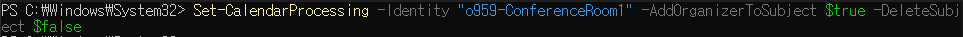 Set-CalendarProcessing -Identity "o959-ConferenceRoom1" -AddOrganizerToSubject $true -DeleteSubject $false