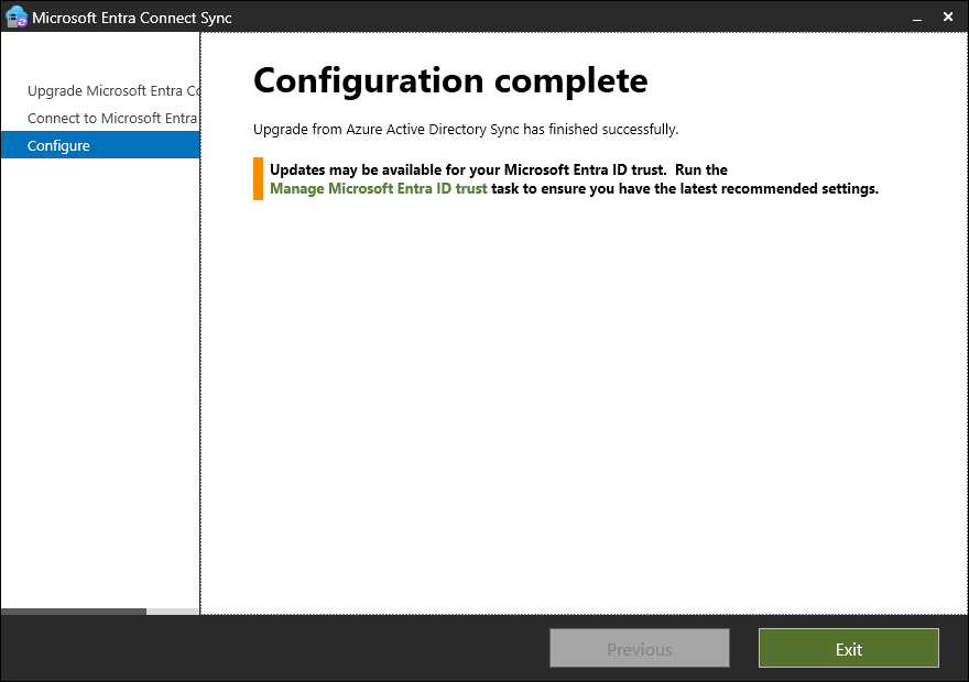 업그레이드가 완료됬다고 하는데 Manage Microsoft Entra ID Trust ~ 관련 문구가 출력되네요