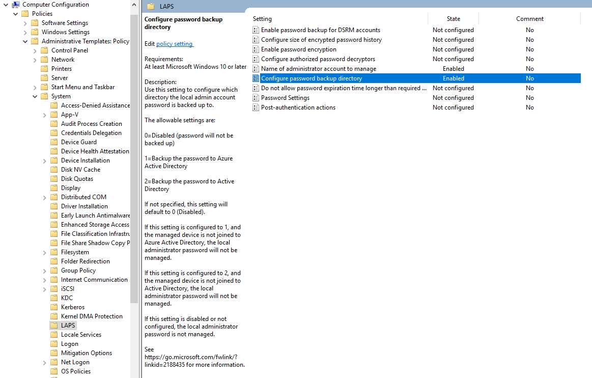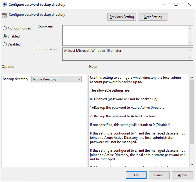 Configure password backup directory : 로컬관리자 패스워드를 백업할 디렉토리를 선택