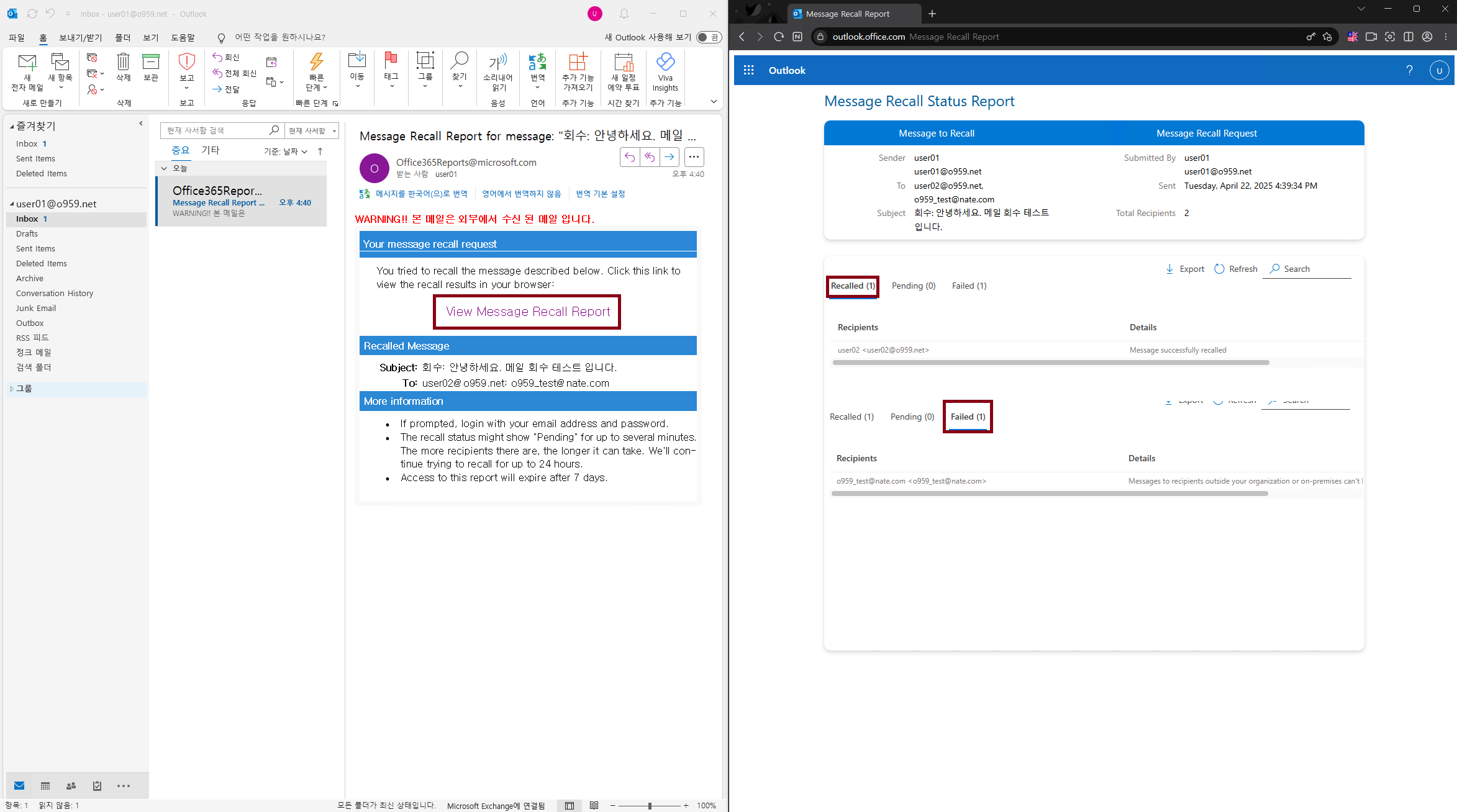 View Message Recall Report를 클릭하면 Recalled 된 (동일한 테넌트)의 현황과