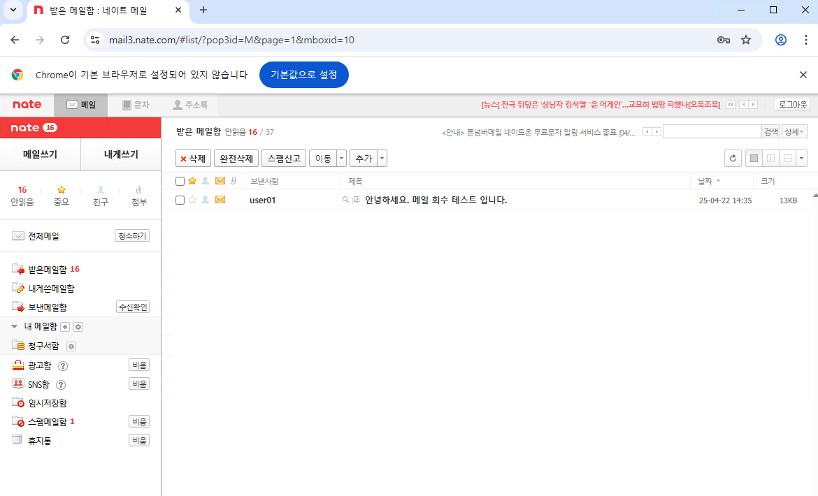 그에 비해 다른 메일시스템 (네이트) 에서는 역시 메일이 삭제가 되지 않네요