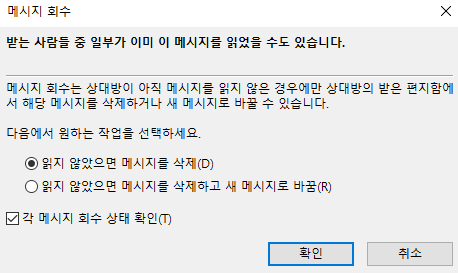 [읽지 않았으면 메시지를 삭제] 선택 후 [확인] 클릭