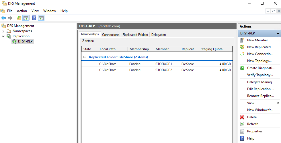 | dfs1.o959lab.com | 10.10.10.102 20.20.20.11 (HB Network) 10.10.10.15 (Cluster VIP) 10.10.10.16 (DFS VIP) |