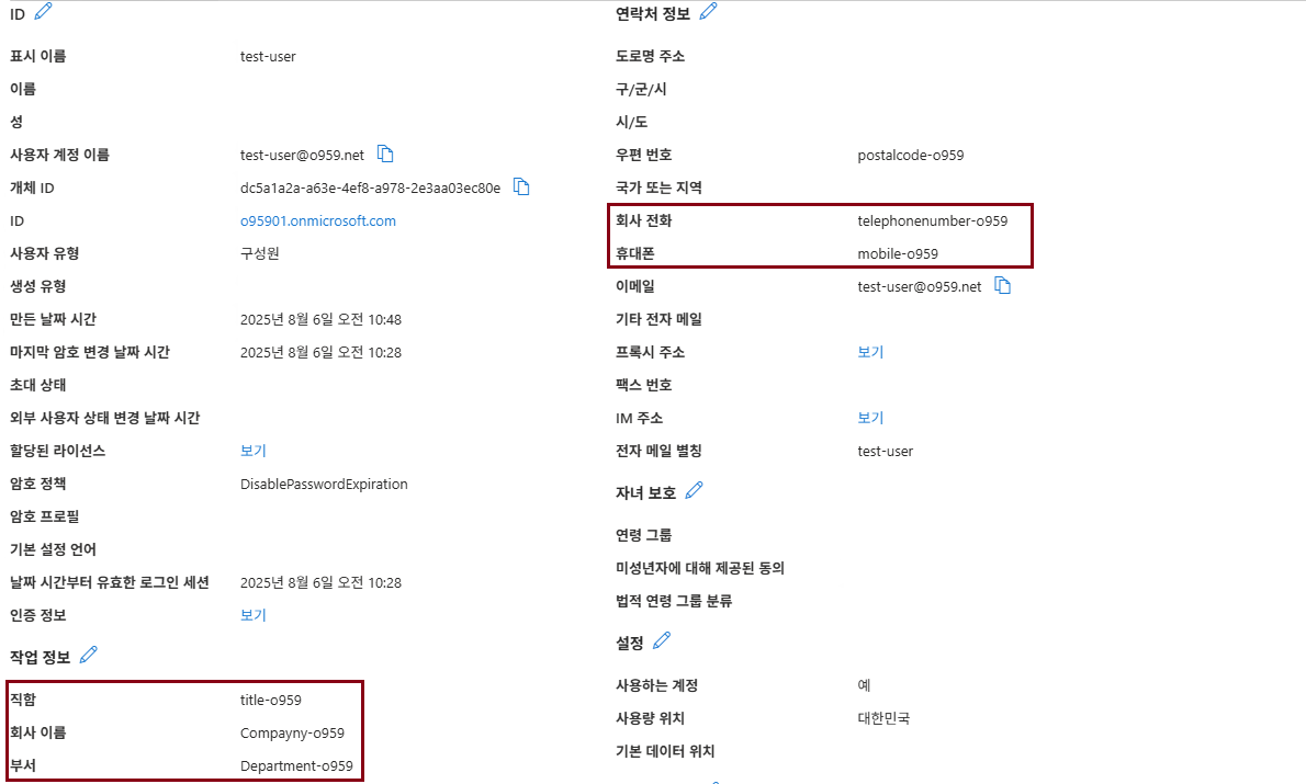 Teams의 연락처 카드에 표시되는 정보가 Entra ID의 계정 속성 값을 이용해서 표시해주고 있는데