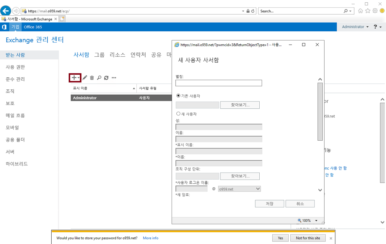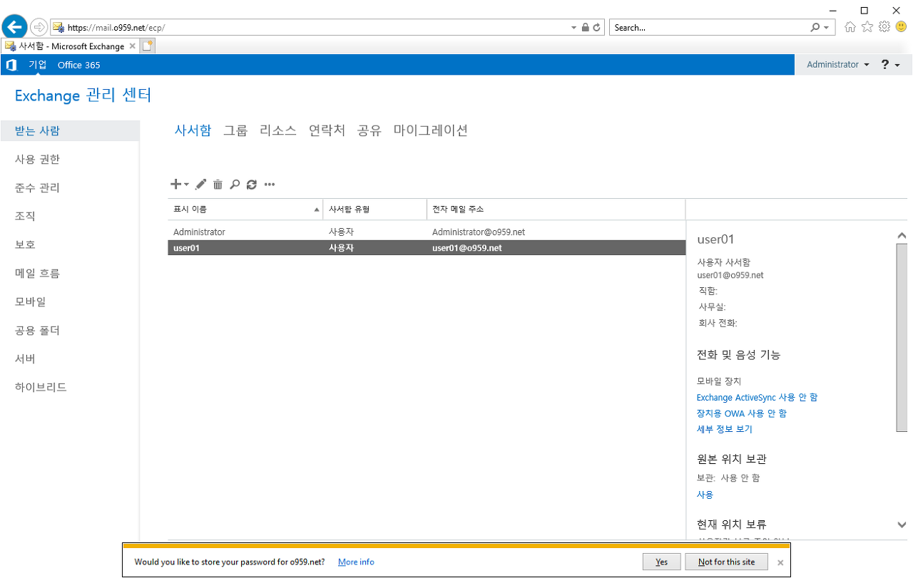 Exchange 관리센터 접속 - [받는 사람] - [사서함]