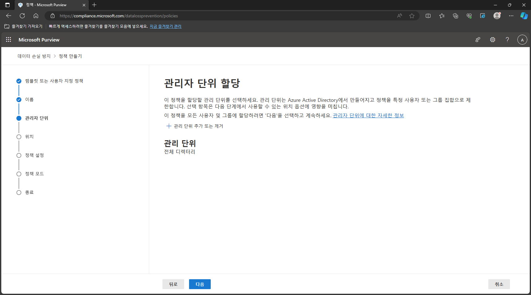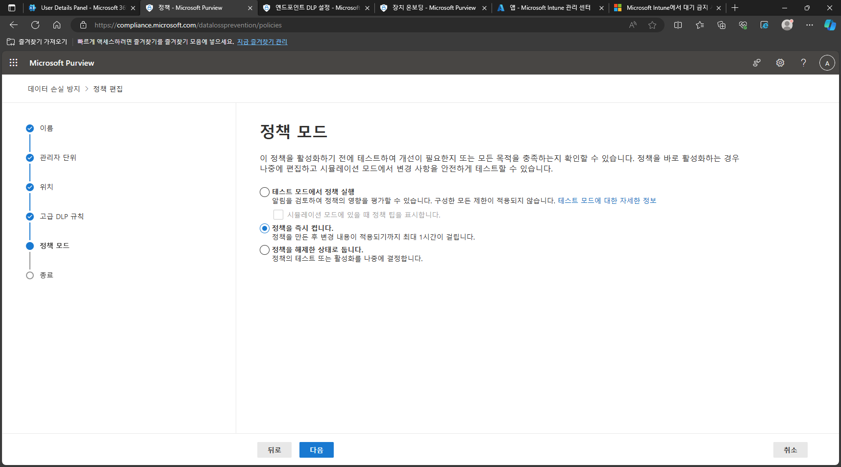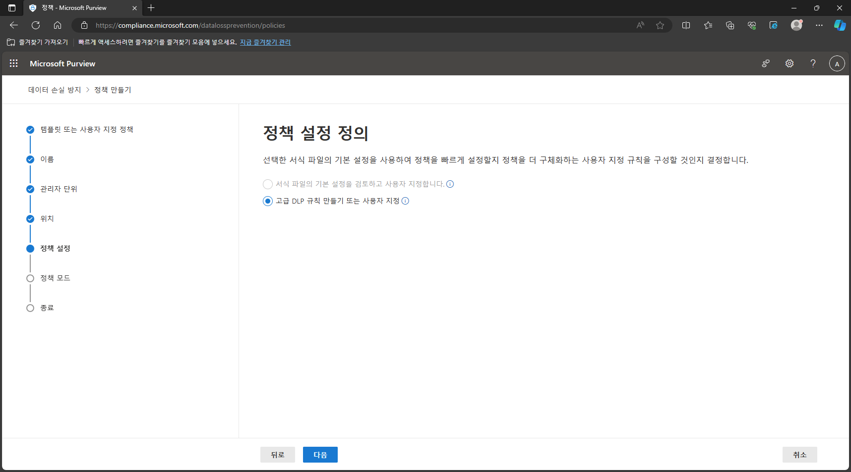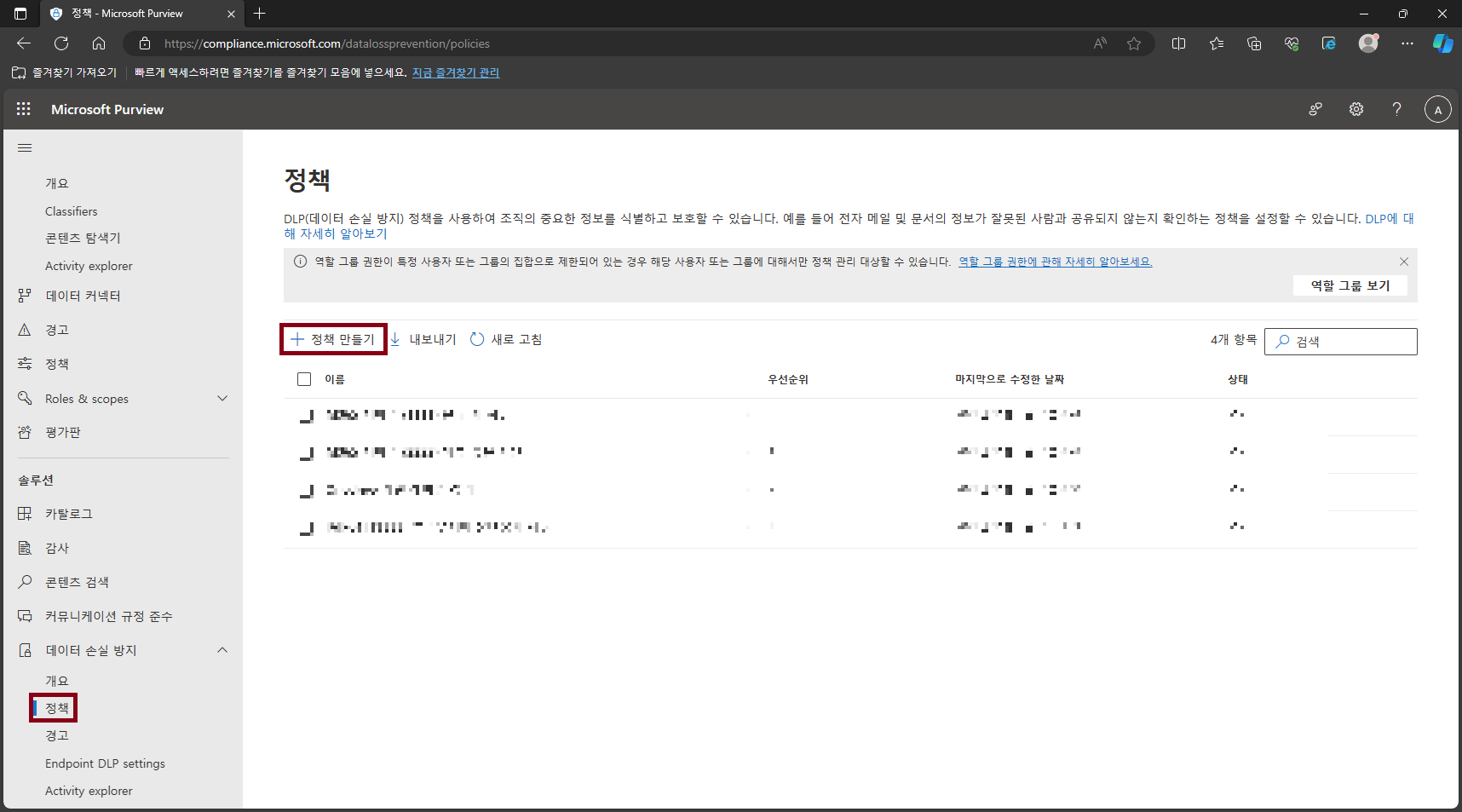 [데이터 손실 방지] - [정책] - [정책 만들기] 클릭해주세요