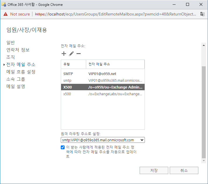 위 처럼 Exchange Online으로의 전자메일 주소 형식은 정상적으로 생겼어요