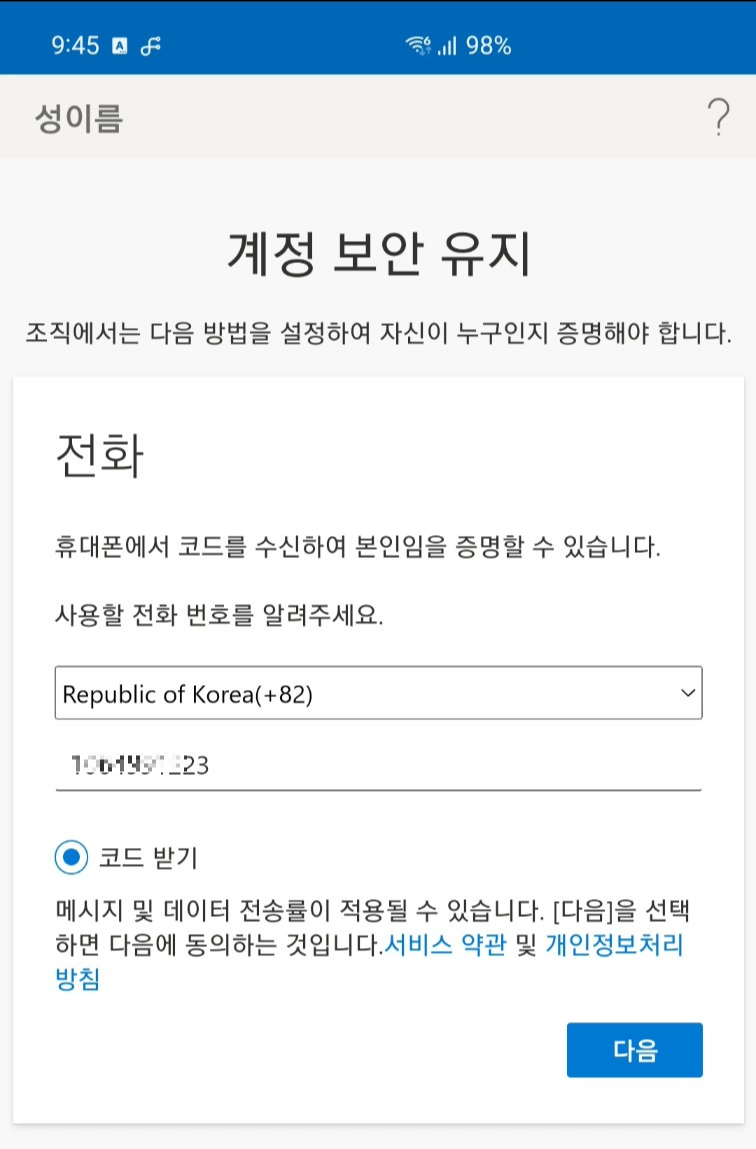 저는 확인 옵션을 휴대폰에 문자 메시지 전송만 체크 후 저장했어요