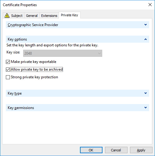 Private Key Tap의 Key Option 중 Make Private Key Exportable과 Allow Private Key to be Archived를 체크해주세요