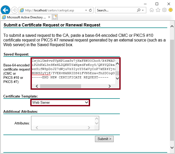 Certificate Template을 Web Server로 변경하고 Submit을 눌러주세요