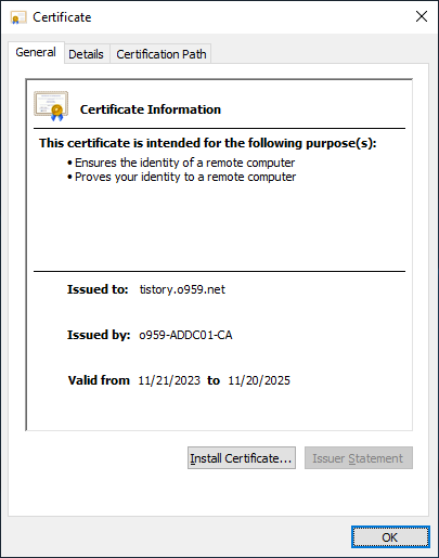 다운받고 설치한 인증서를 더블클릭하여 개인키가 있다는 문구 확인 가능