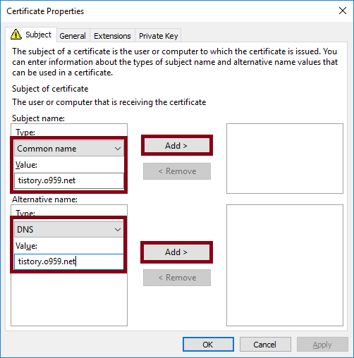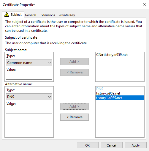 Alternative name의 Type을 DNS로 지정하고 Subject Name외 필요한 인증서 이름을 넣어 줍니다.