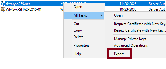 Yes Export the Private Key 메뉴가 활성화 되는지 확인