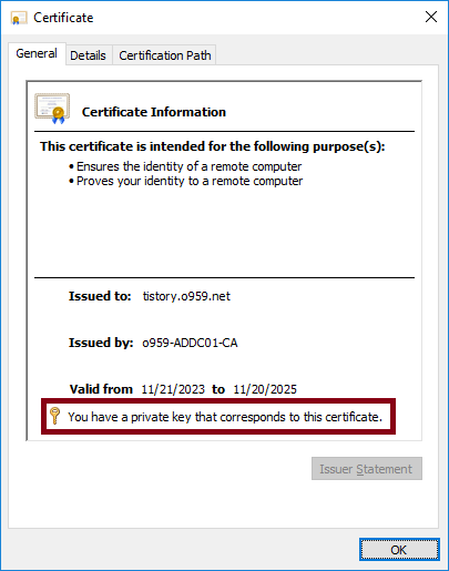 다운받고 설치한 인증서를 더블클릭하여 개인키가 있다는 문구 확인 가능