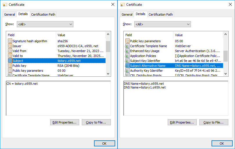Subject 값과 Subject Alternative name 값이 정상적인지 확인