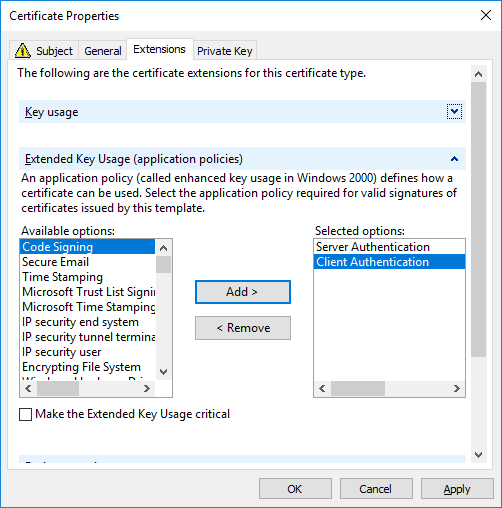 Extention Tap에 Extended Usage의 Client Authentication을 추가 해주세요
