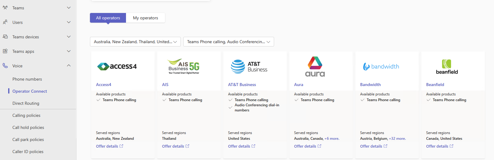 위에 보시는것 처럼 Operator Connect에서 각 통신사업자를 골라서 사용할 수 있어요