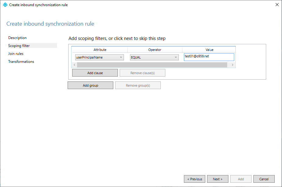 저는 UPN이 test01@o959.net 인 사용자에 대해서만 Filter 했어요