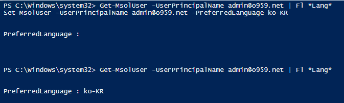 Set-MsolUser -UserPrincipalName admin@o959.net -PreferredLanguage ko-KR언어 설정 변경