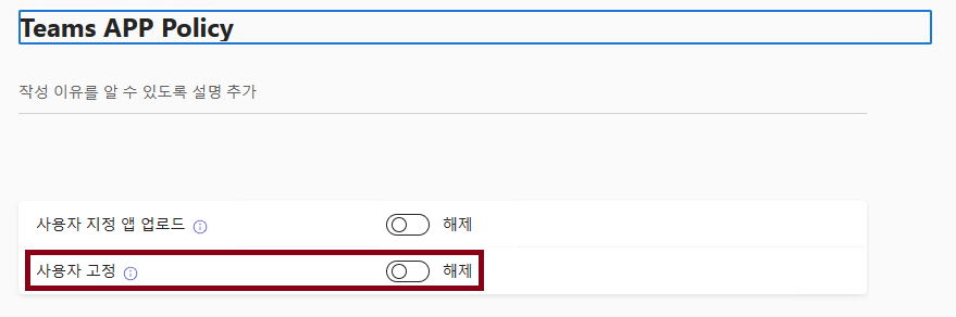 사용자 고정 : 해제 (해당 설정 해제로 사용자가 Teams 좌측 APP의 순서를 변경할 수 없게 되요)