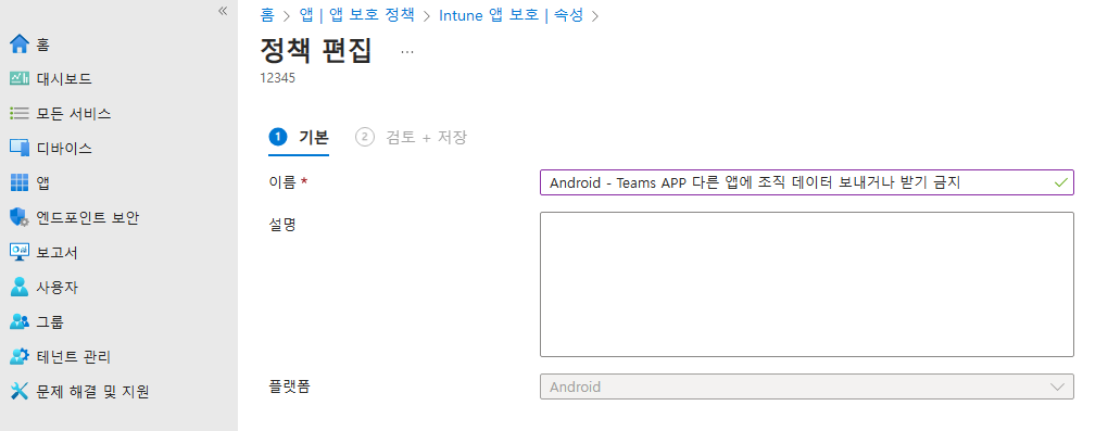 [https://Intune.microsoft.com (인튠 관리센터) 접속] - [앱] - [앱 보호 정책] 클릭해주세요